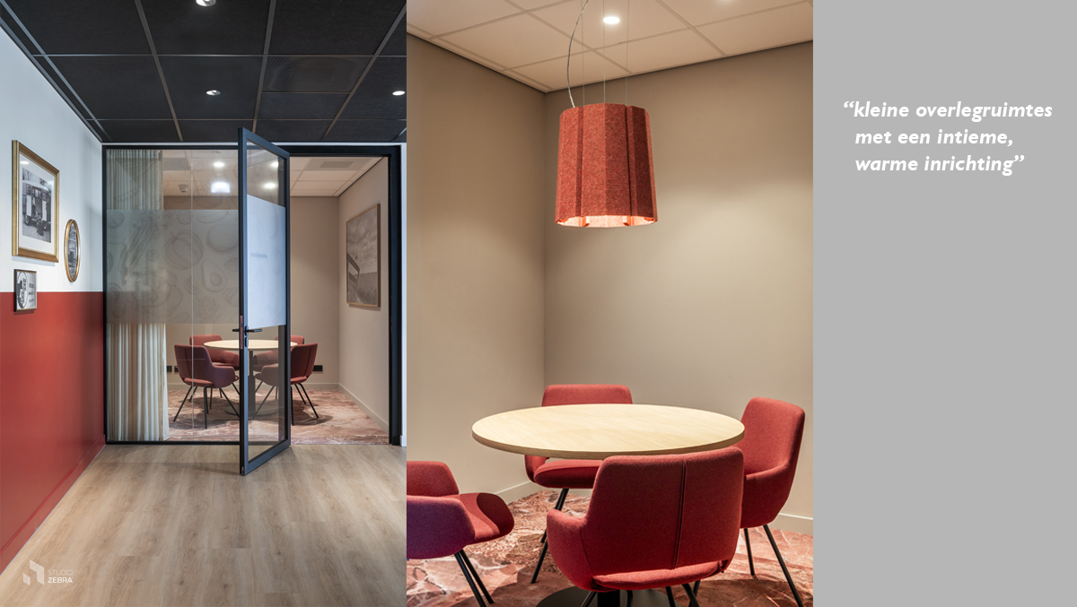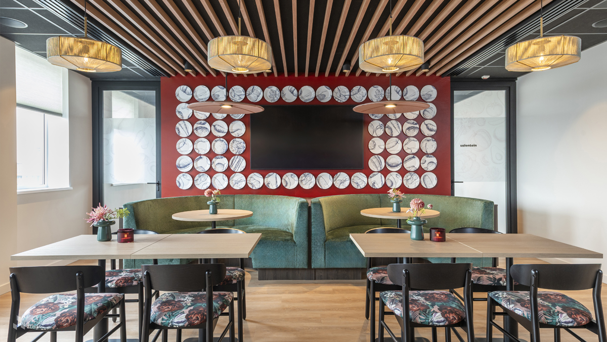 Huuskes schotelt de maaltijd voor; een bord vol. De cliënt van Huuskes heeft veel op zijn bord en wordt door Huuskes ontzorgd. EEN BORD VOL met passie, natuur, verhalen, waardering, inspiratie, geluk, troost en aandacht. Het bord is hiermee een prachtig symbool voor wat Huuskes betekent voor zijn cliënten. Voor ons een thema dat we op verschillende manieren in het interieur hebben laten terugkomen, zodat het verhaal van Huuskes symbolisch wordt verteld. Afgeronde vormen bij de entree en de bar, ronde zitbanken en lampen van bordjes boven de kantinebar. Maar het thema komt misschien wel het meest naar voren op de rode wand vol echte borden, die een speciale “Delfts Blauwe’ print kregen. En natuurlijk de iconische bijzettafeltjes van Louise Cohen met echte borden, kop- en schotels op een voet.