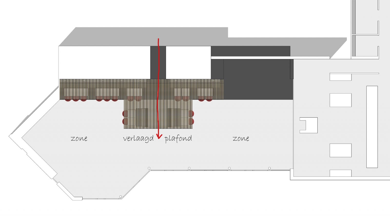 We hebben het restaurant in zones opgedeeld. Een donkere intieme zone en een lichte, open zone grenzend aan de tuin. Als verbindend element hebben we in het restaurant een lange houten lamellenwand bedacht. De lamellen lopen zelfs in het plafond door, waardoor extra intimiteit ontstaat. Bij de entree steekt het houten plafond verder de ruimte in, zodat de open ruimte visueel in twee zones wordt verdeeld. Op deze manier ontstaan plekken waar men op verschillende manieren met elkaar kan zitten. Lange tafels, ronde tafels, banken, hoge tafels met krukken, vergaderunits en een lounge. Voor ieder wat wils. In de keuze van het meubilair en de verlichting benadrukken we het thema ‘verbinden’. De houten stoelen en honingraat lampen hebben een zichtbare houtverbinding. Er is ook veel meubilair dat uit twee materialen bestaat, waardoor een verbinding zichtbaar wordt. Achter de huiskamer is een groenwand gemaakt, als verbinding met de tuin.
